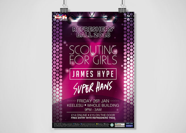 Nights out at Keele University are one of the key sources of income for the Students' Union. As Graphic Designer I am responsible for creating eye catching, high impact and on trend promotional material to advertise entertainment events to the student populous and local community. I create visual concepts for each event and apply the design across multiple platforms including. Large format posters, TV screens, animated social media posts, event wristbands, website graphics and urban advertising such as light projections and pavement campaigns.